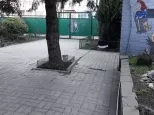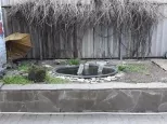 На участке декоративный бассейн, хоз.постройки, навес, двор в плитке.